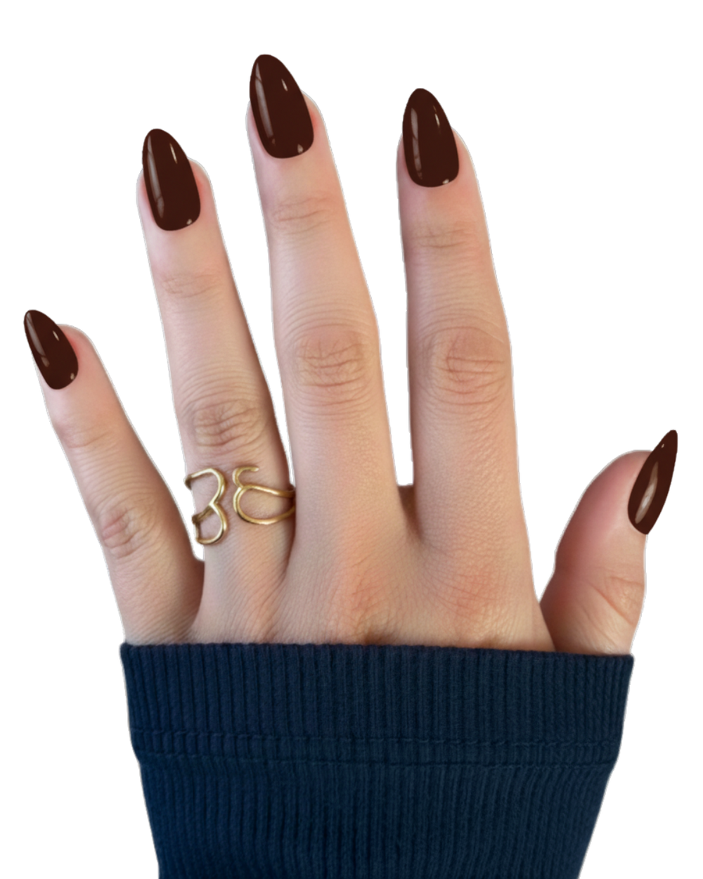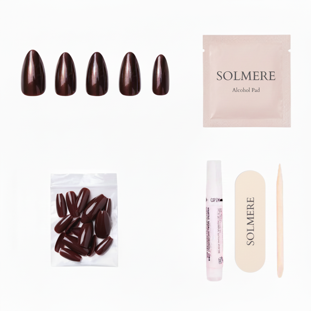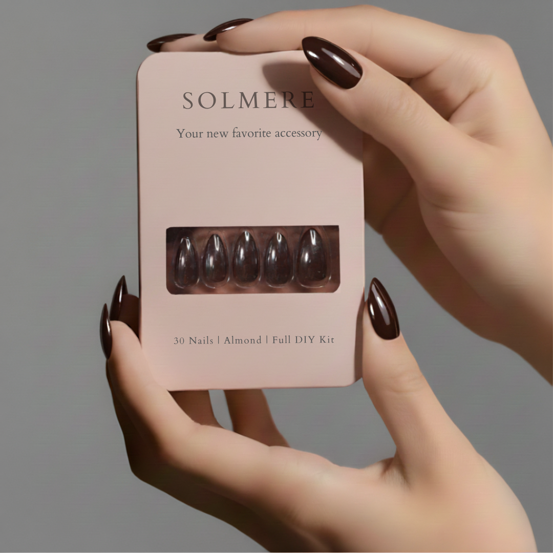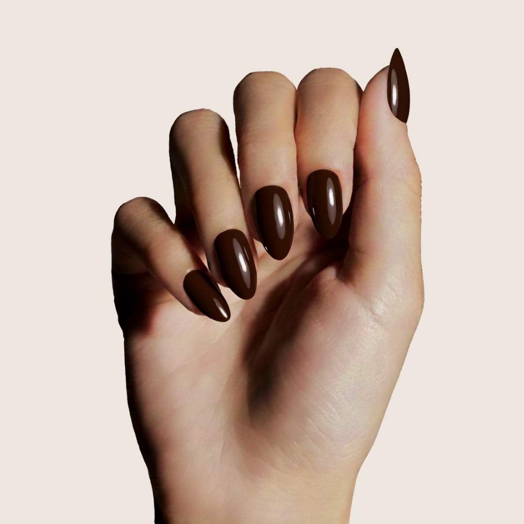 Small almond shape elongates without getting in the way. Flex-fit base feels natural, protects your real nails. Rich brown finish wears beautifully for up to 14 days—no chipping, no lifting.
