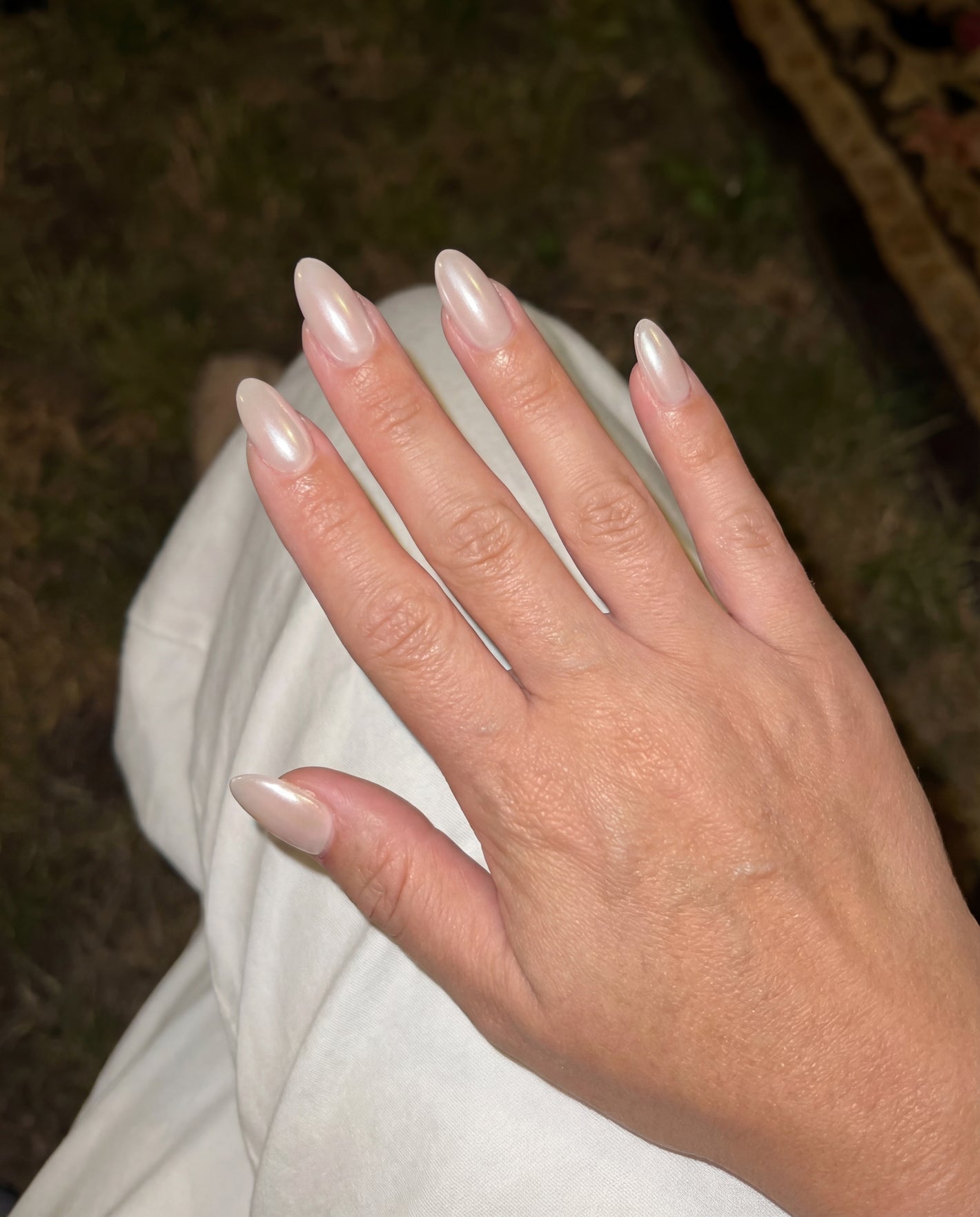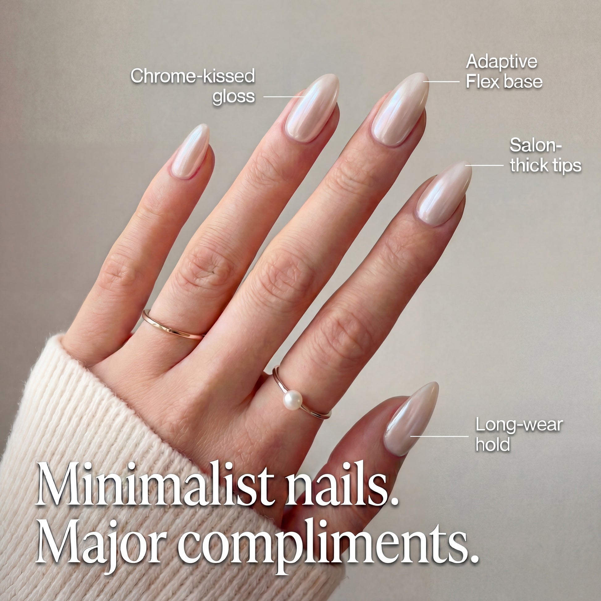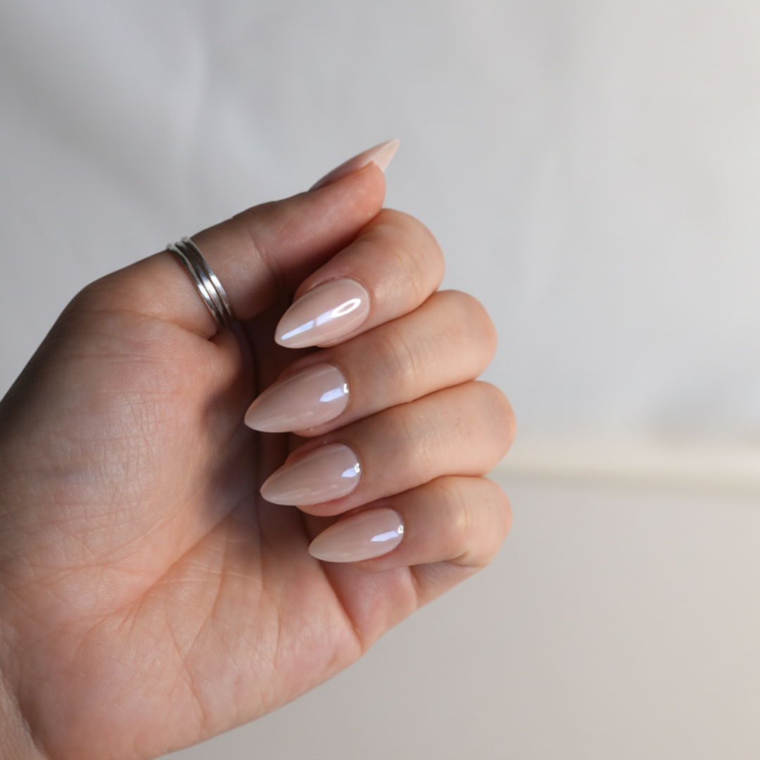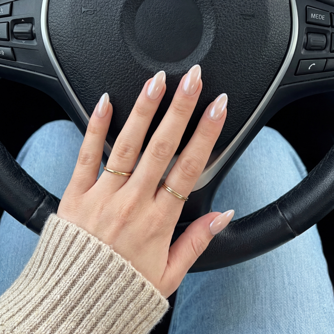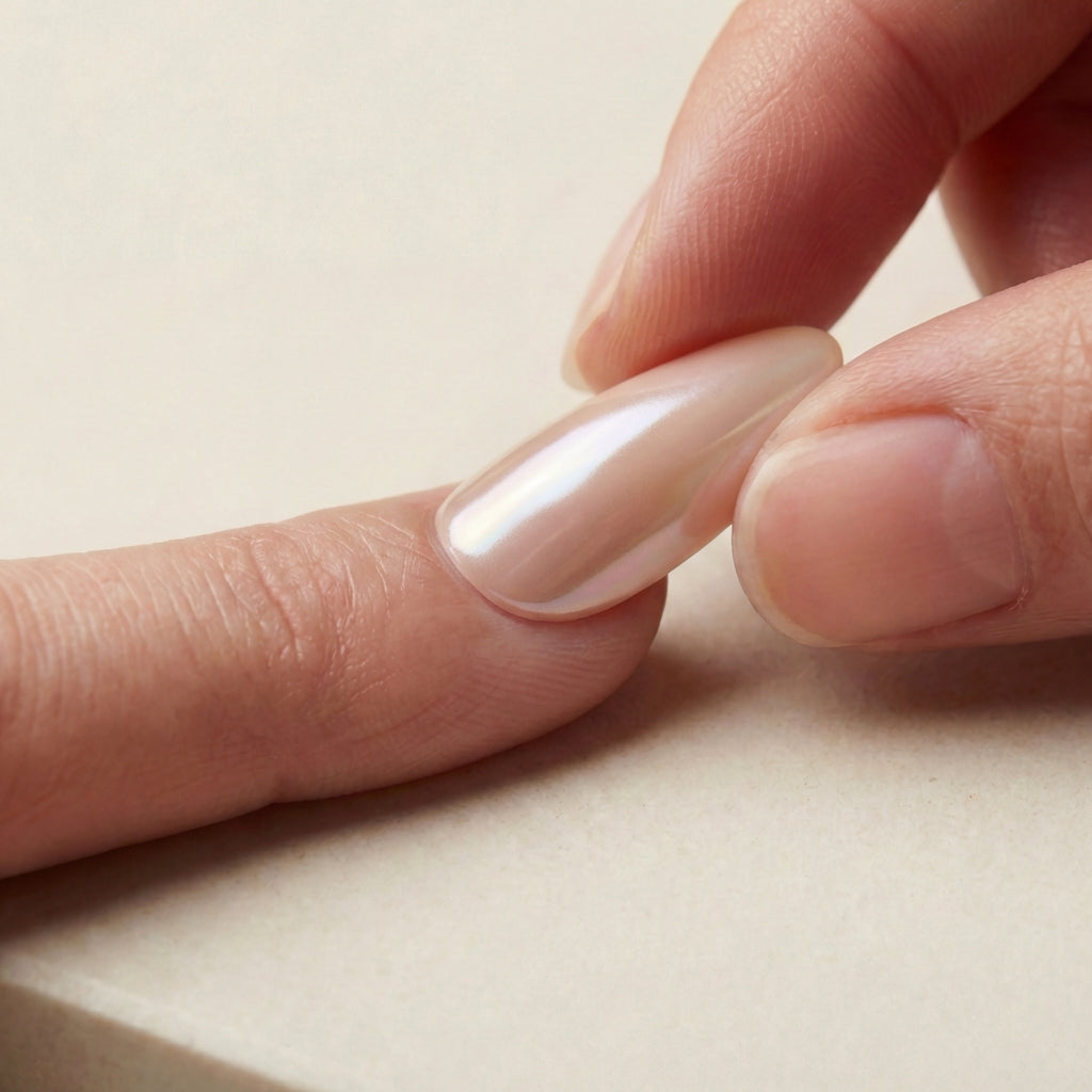Milky pink-white with a soft blush undertone. Chrome finish. The "your nails but better" shade.