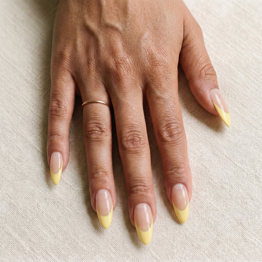 Soft pastel yellow tips on a clean nude base — a modern French manicure that feels like the first warm day of spring.